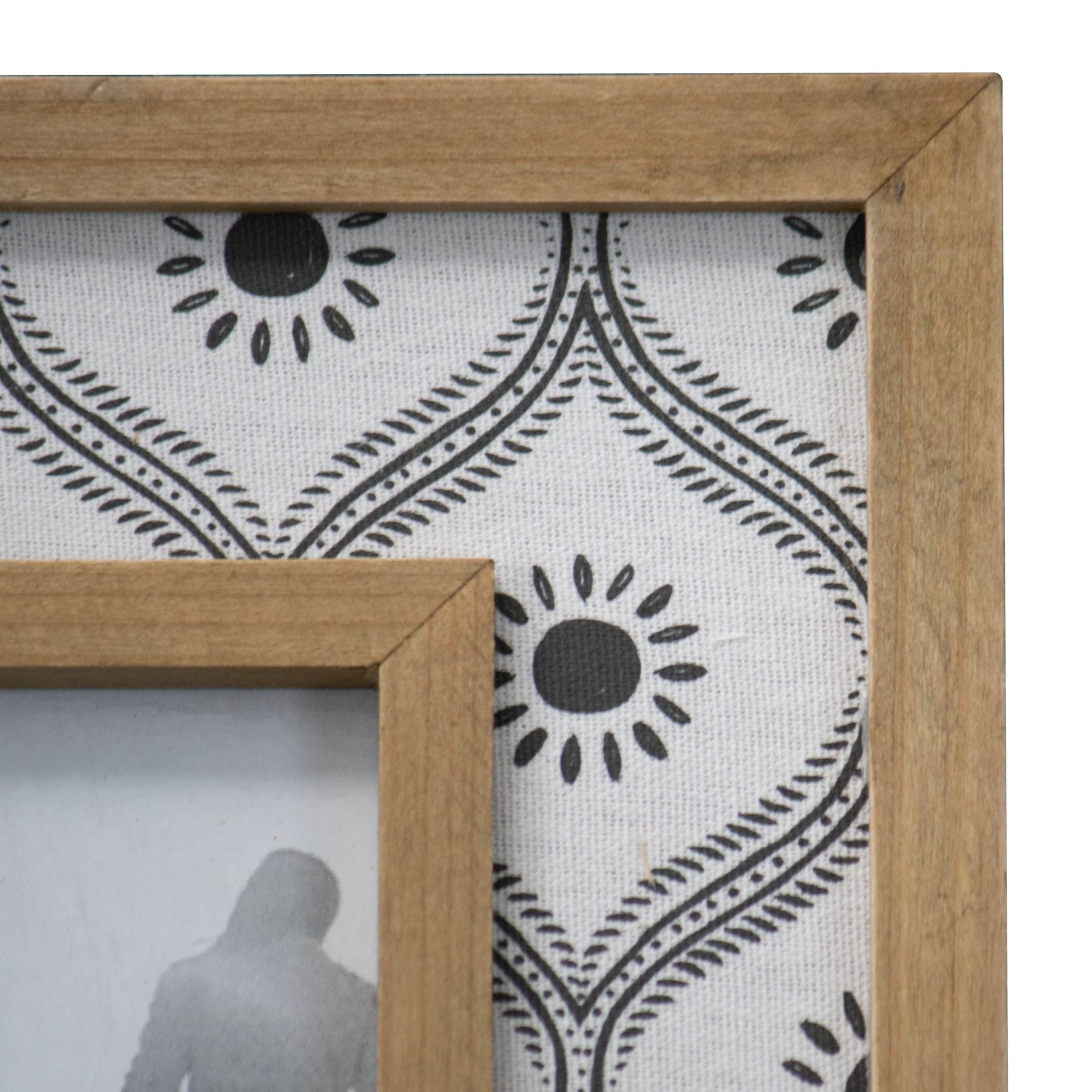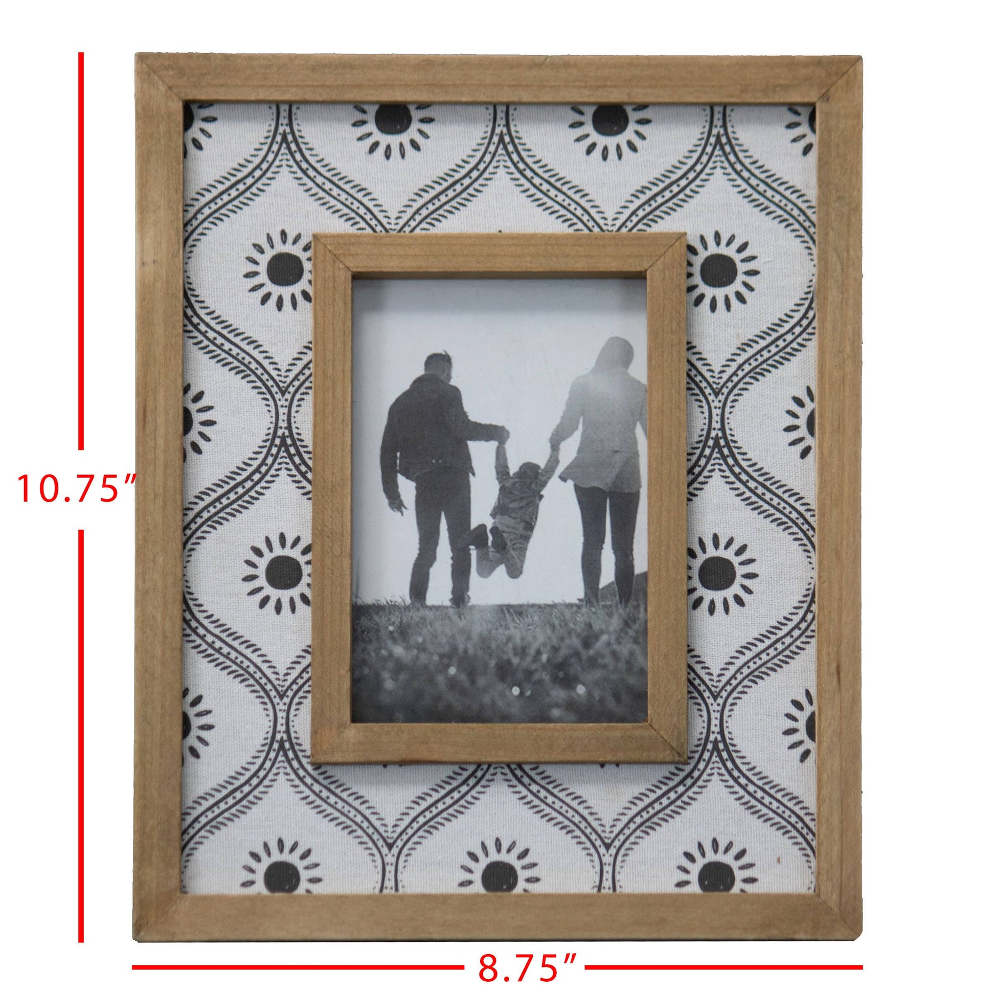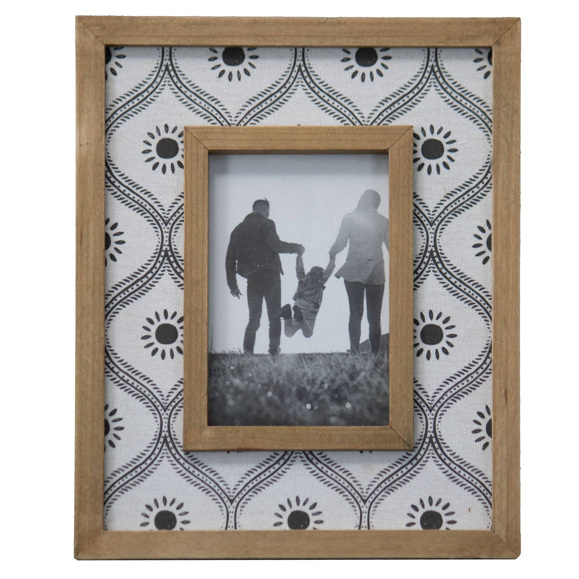 A unique material combination paired with an exclusive design from Foreside Home & Garden makes this 4x6 photo frame the perfect addition to your traditional home decor. Two natural wood borders frame a white canvas inlay printed with a block print inspired floral pattern. The mixture of wood and fabric create a textural option to display your favorite photos. The glass front will help to protect your photo from dust and other damage. Easily styled on your shelf, desk, side table, mantel, or hung on a wall for a versatile display anywhere in your home.