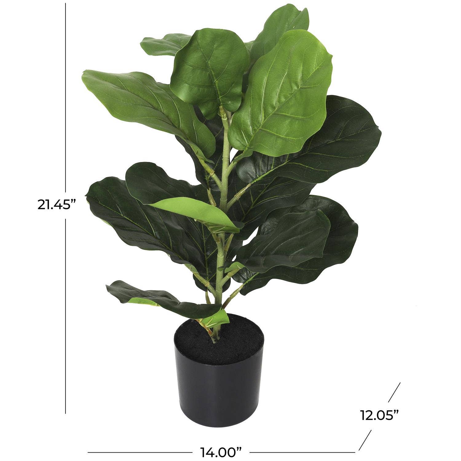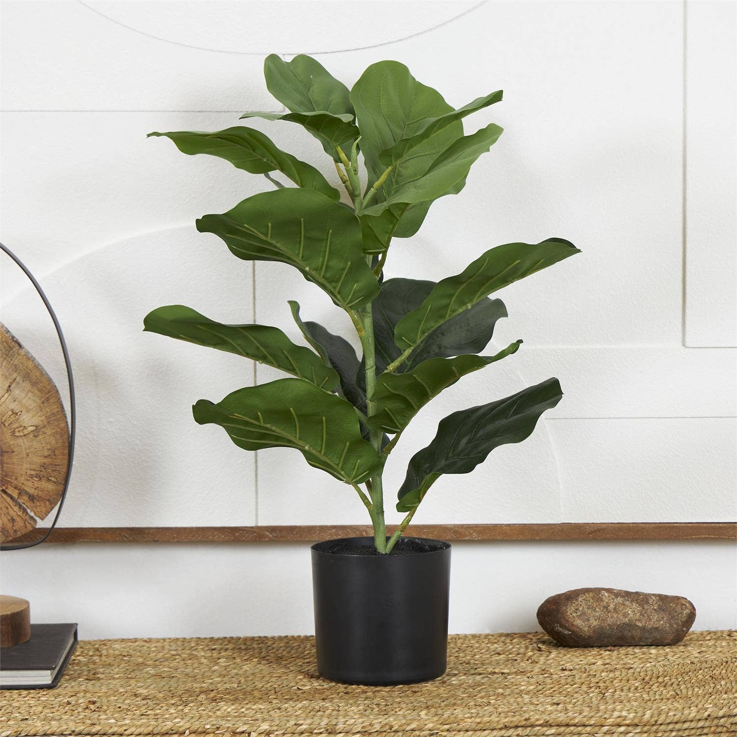 Realistic looking fiddle fig plant has fabric leaves and is potted in a black, plastic pot.