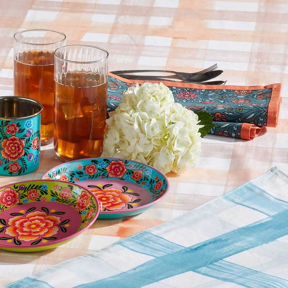 Bring the beauty of a summer garden in full bloom to your table. These handmade textiles made from cotton canvas are screen printed with a colorful floral design and bold teal border. Set of 4 napkins. Pair with the matching runner and napkins for a floral table!