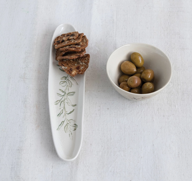 This elegant stoneware tray showcases a delicate debossed botanical design that is food safe in a naturally variating reactive glaze.