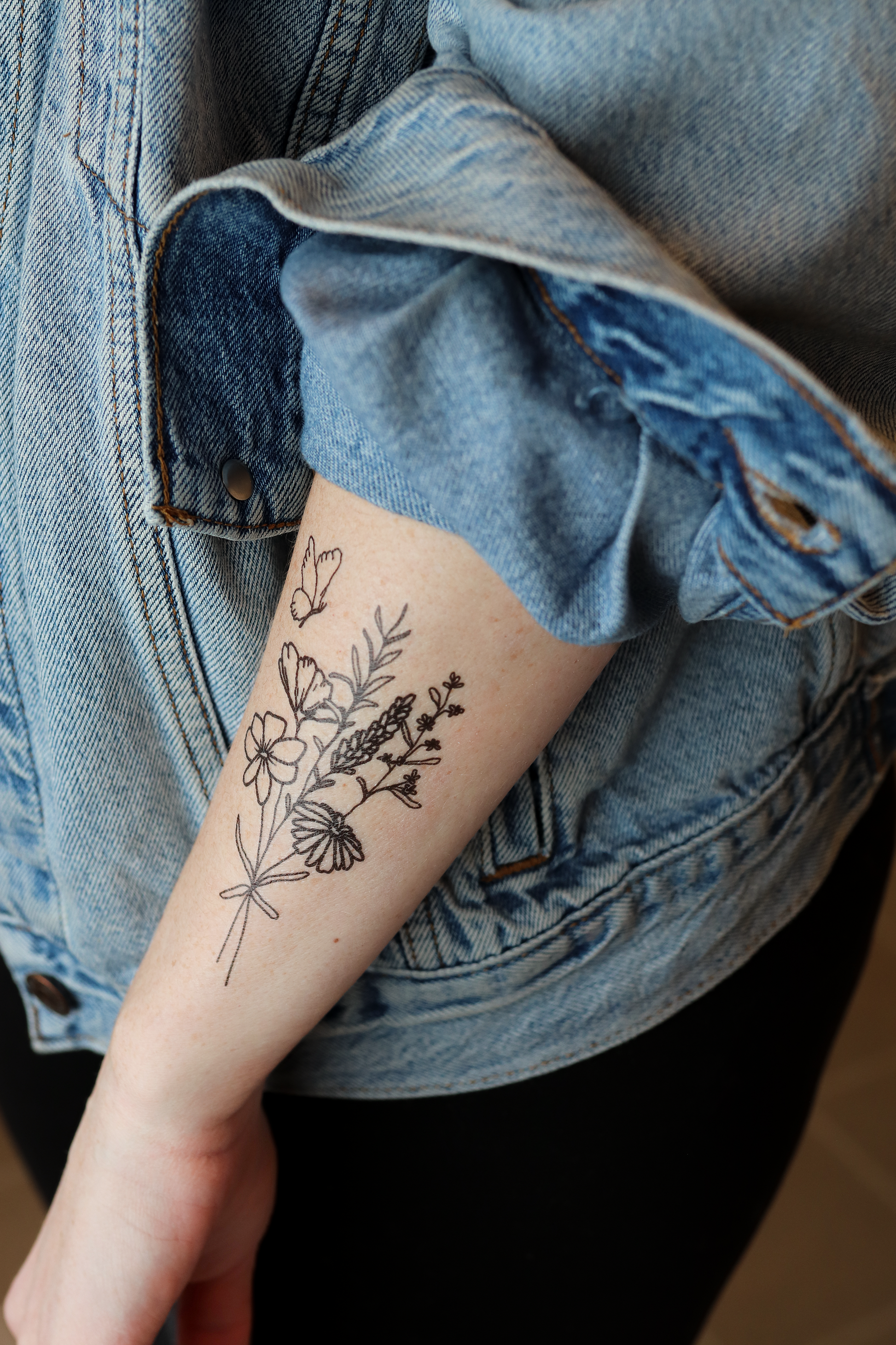 Featuring an originally hand-drawn bouquet of delicate flowers with a butterfly, this temporary tattoo makes a thoughtful small gift or a pain-free way to try out a tattoo!