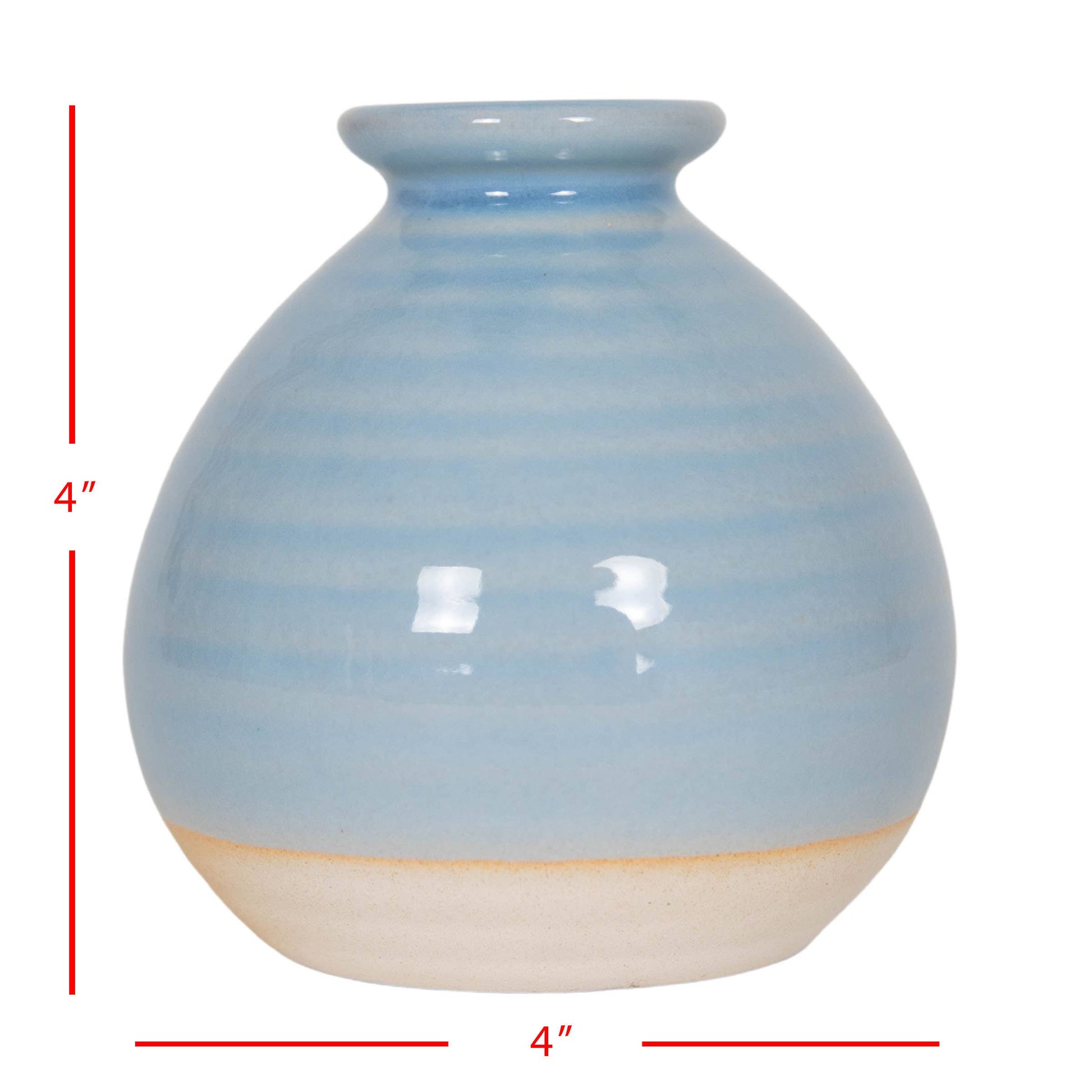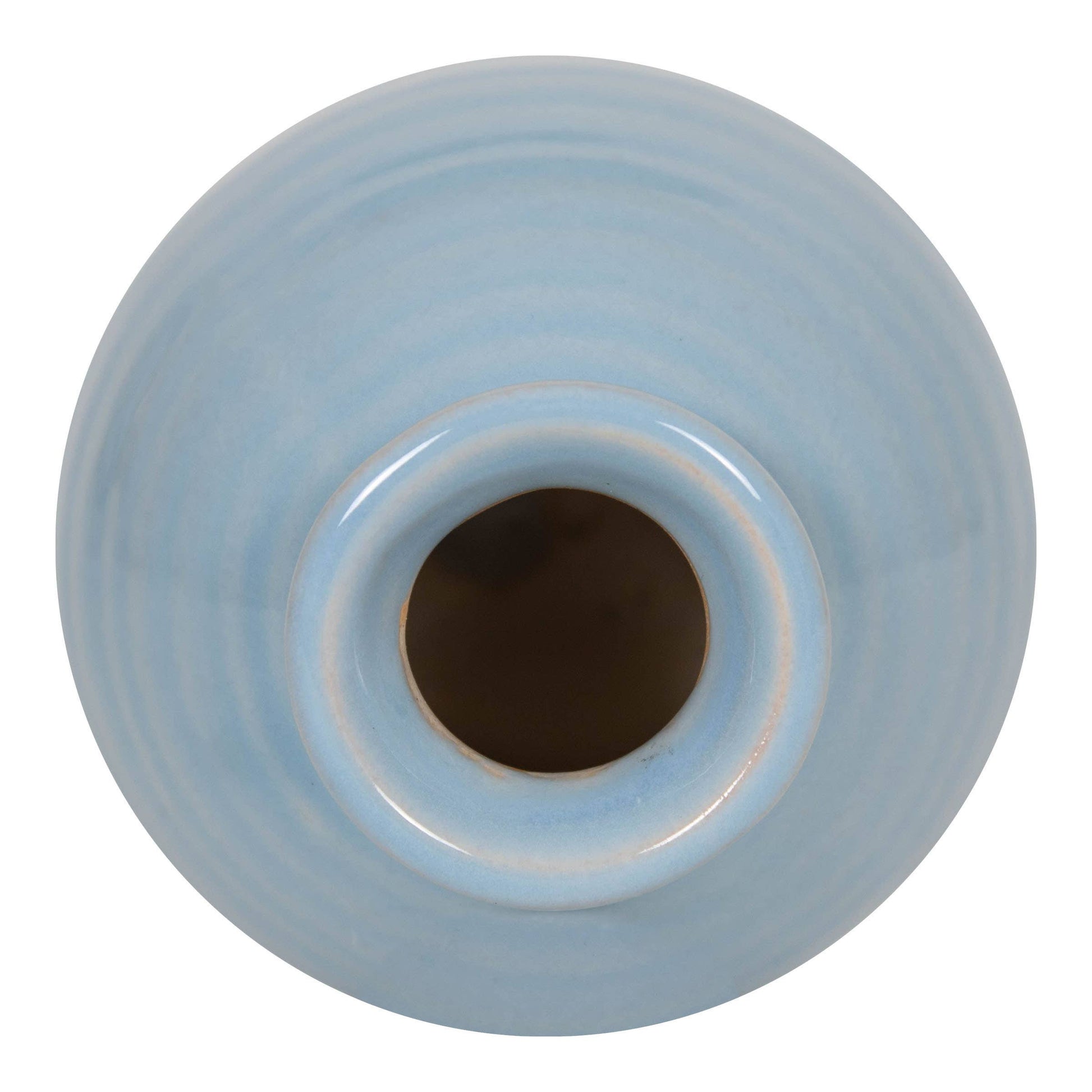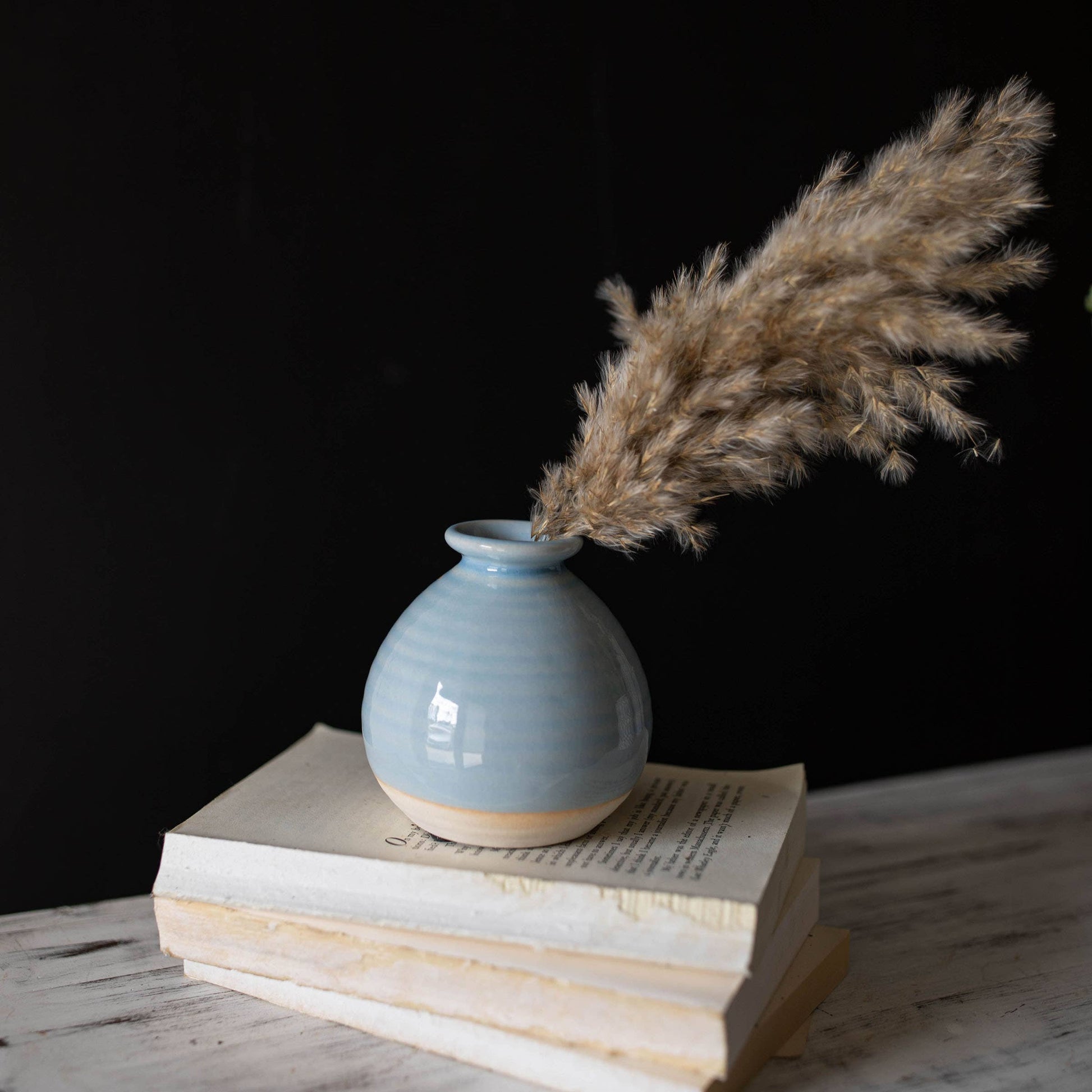 This gorgeous ceramic bud vase is a must have to pair with traditional or boho style decor. A classic light blue crackle dipped glaze accentuates the ribbed texture, giving way to a rim of raw stoneware along the base. This textural earthenware vase easily transitions from season to season with its subtle color, and is great for faux stems, fresh stems or as a standalone accent. -Great for stems or leave empty as a decorative vessel.