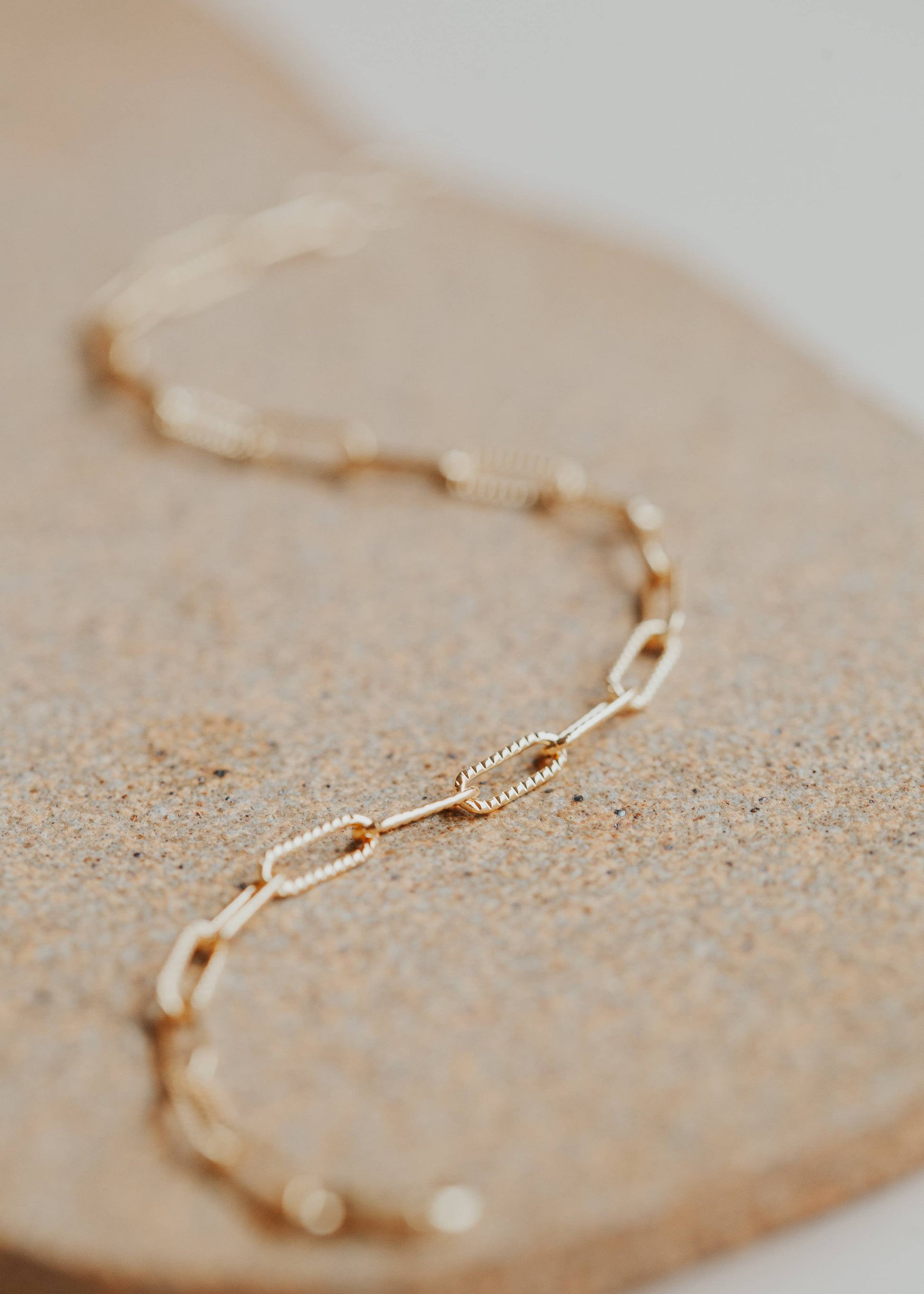 A minimal cable chain but with the most darling detail! The patterned design on each link catches the light and glistens in the golden sun. We love this cable chain bracelet paired with dainty and bold chains alike.