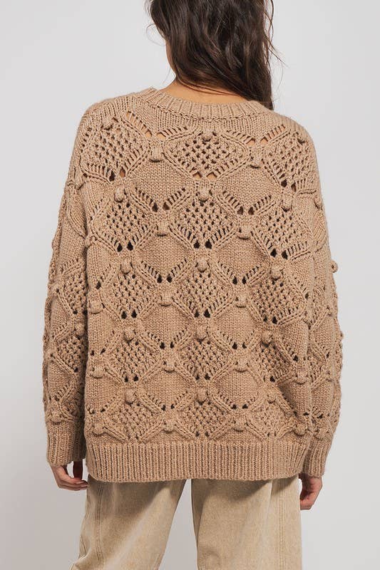 This cozy crewneck sweater features an intricate crochet knit pattern with paneled texture and bobble details for a handcrafted look. The relaxed, oversized fit and ribbed cuffs make it perfect for layering on cool days. Pair with jeans or trousers for effortless, boho-inspired style.