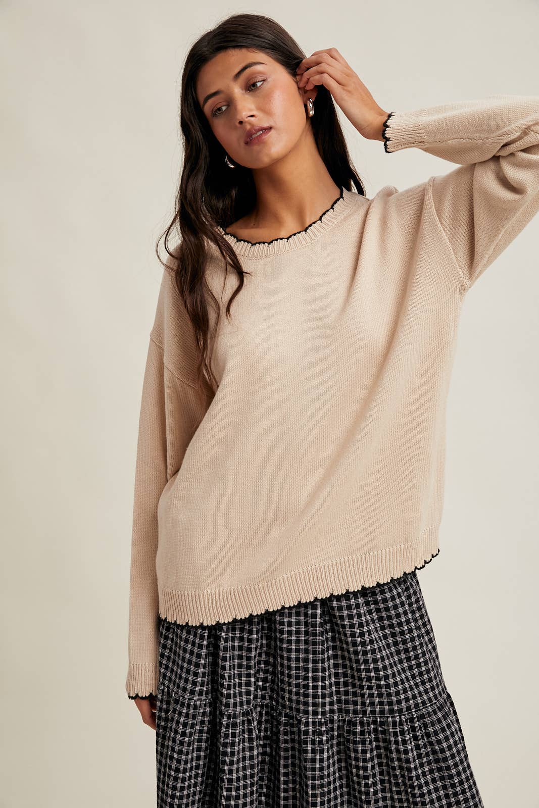 CONTRAST SCALLOPED SWEATER - LONG SLEEVE, EASY, COMFY, FALL, WINTER, CASUAL, LOOSE AND COMFORTABLE FOR ALL-DAY, EVERYDAY WEAR