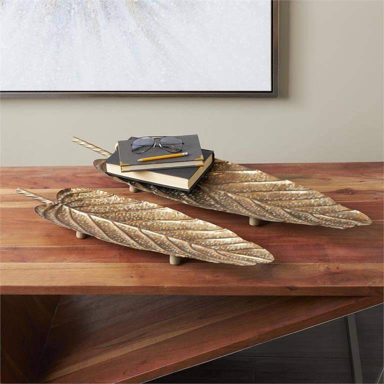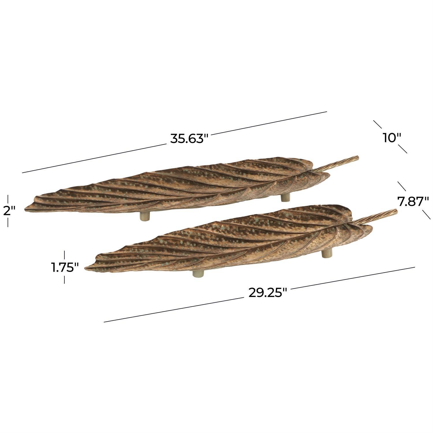 Leaf tray 2-piece set features a satin copper metal finish, adding an elegant and timeless touch to your decor. The standout feature of this metal tray 2-piece set is its leaf texture with patina accents and elevated feet, adding depth and character to the overall design.