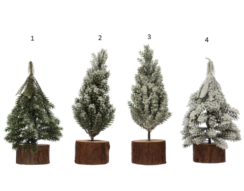 5-3/4"H - 6-3/4"H Faux Pine Tree w/ Wood Slice Base, Snow Finish