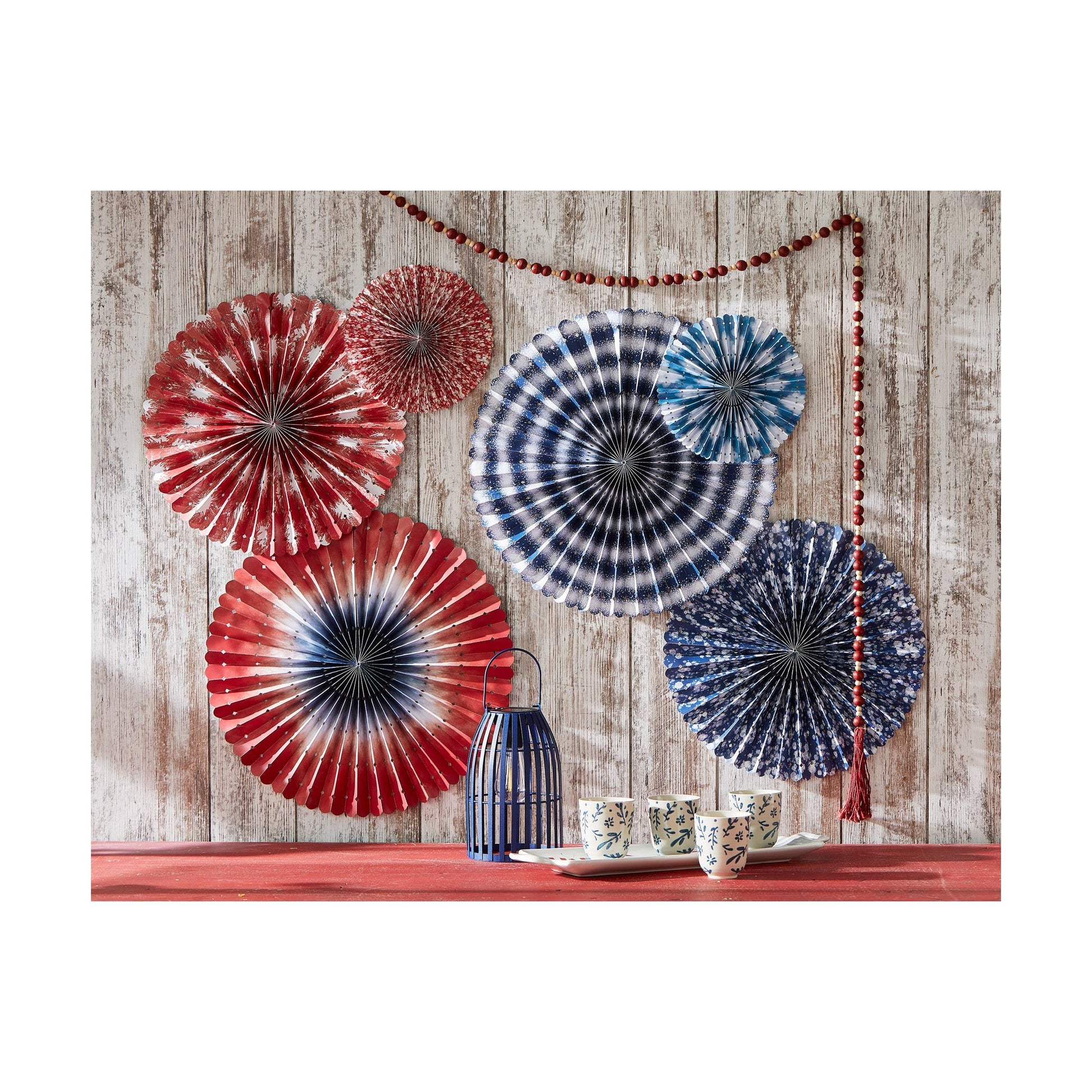 Show off your red, white, and blue! Think outside the box and add a fun and patriotic look to your summer holiday festivities with paper fan decor. Double-sided printed design with cord for hanging, magnetic closure. Set includes 1 each of 3 designs/sizes.