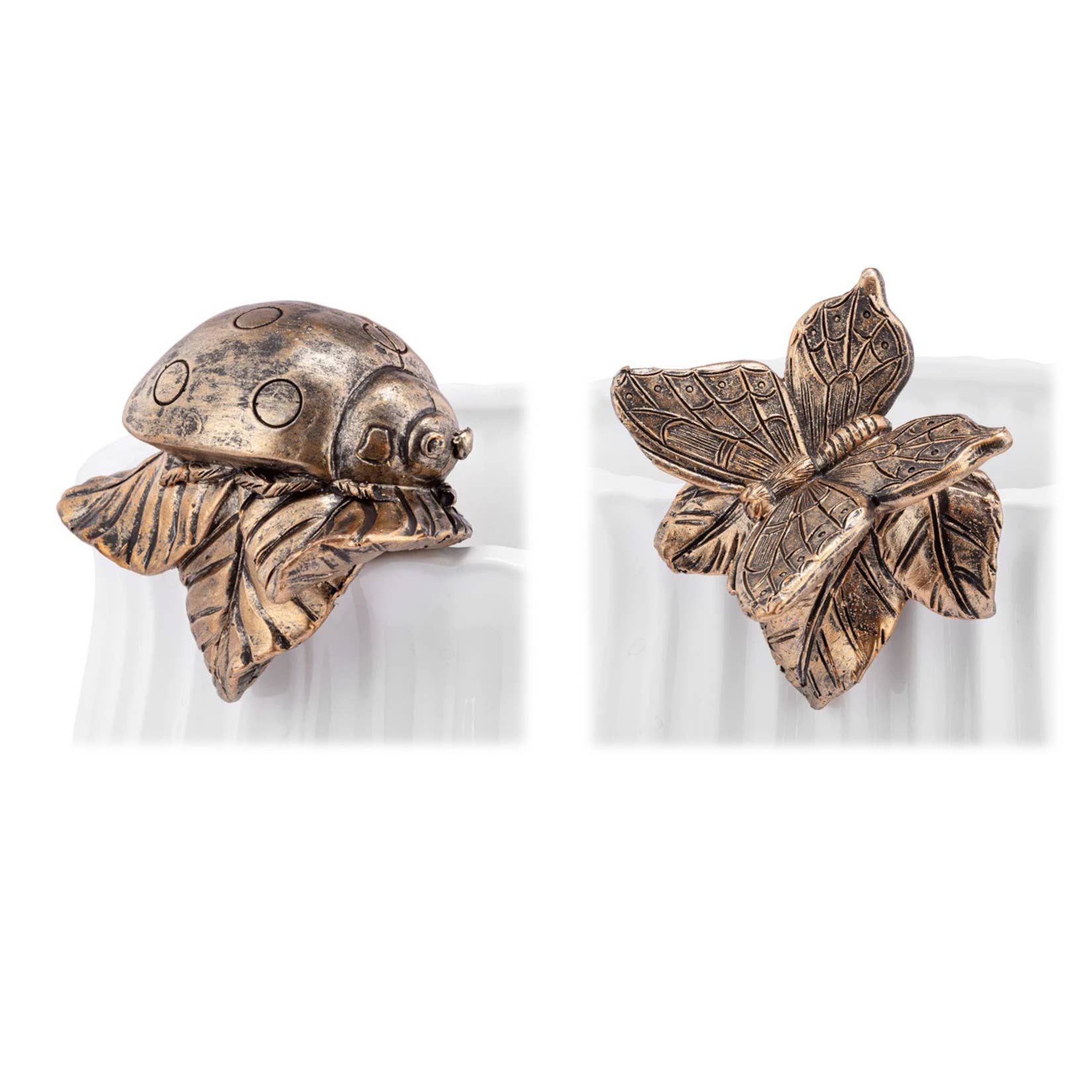 Dress up a pot or container with one of these resin bugs. These are designed to rest on the rim of a planter, pot, vase or container. Ladybug: 3" L x 2" W x 2.5" H Butterfly: 3" L x 3" W x 2" H