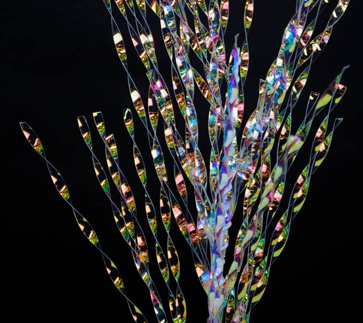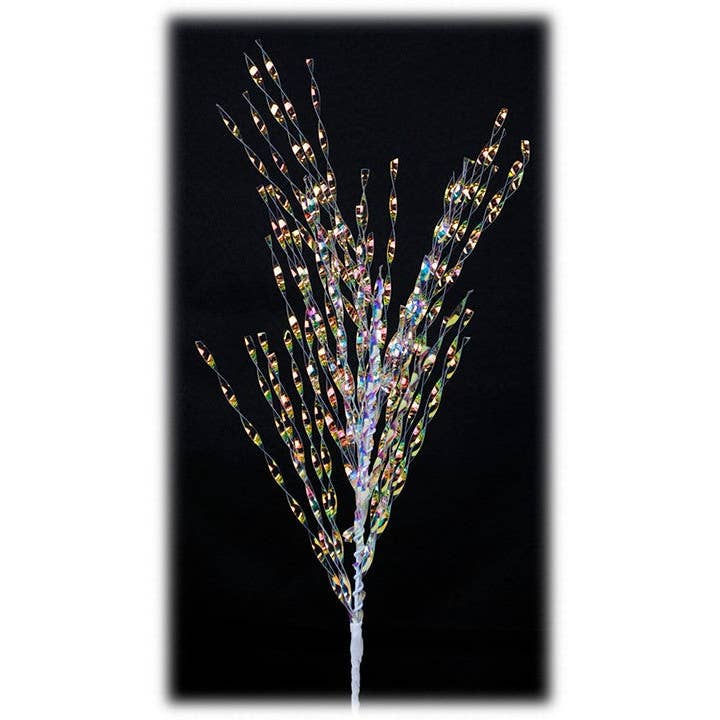 Make your arrangements and containers sparkle with this fun spray. Clear plastic twisted 'grass' has an iridescent finish and a wired main stem.