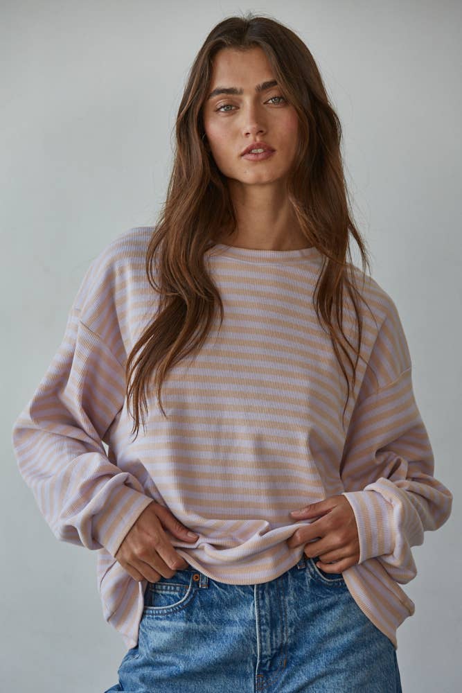 Knit Cotton Spandex Striped and Ribbed Crew Neck Long Sleeve Top