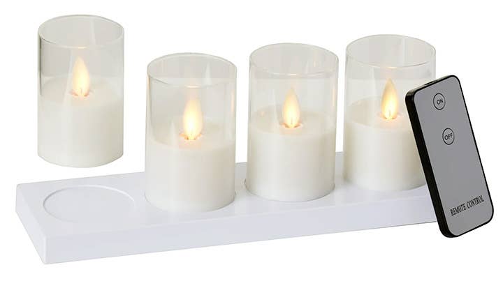 The set includes 4 LED wax candles in glass cylinders with a plug-in charging dock. Simply charge the candles on the charging dock and place on a shelf, tray or your favorite candleholder. The candle will ‘burn’ for about 24 hours. Remote control is included. Once the candle is charged, you can also turn it on and off by flipping the candle over. Set of 4 in 4 different colors.