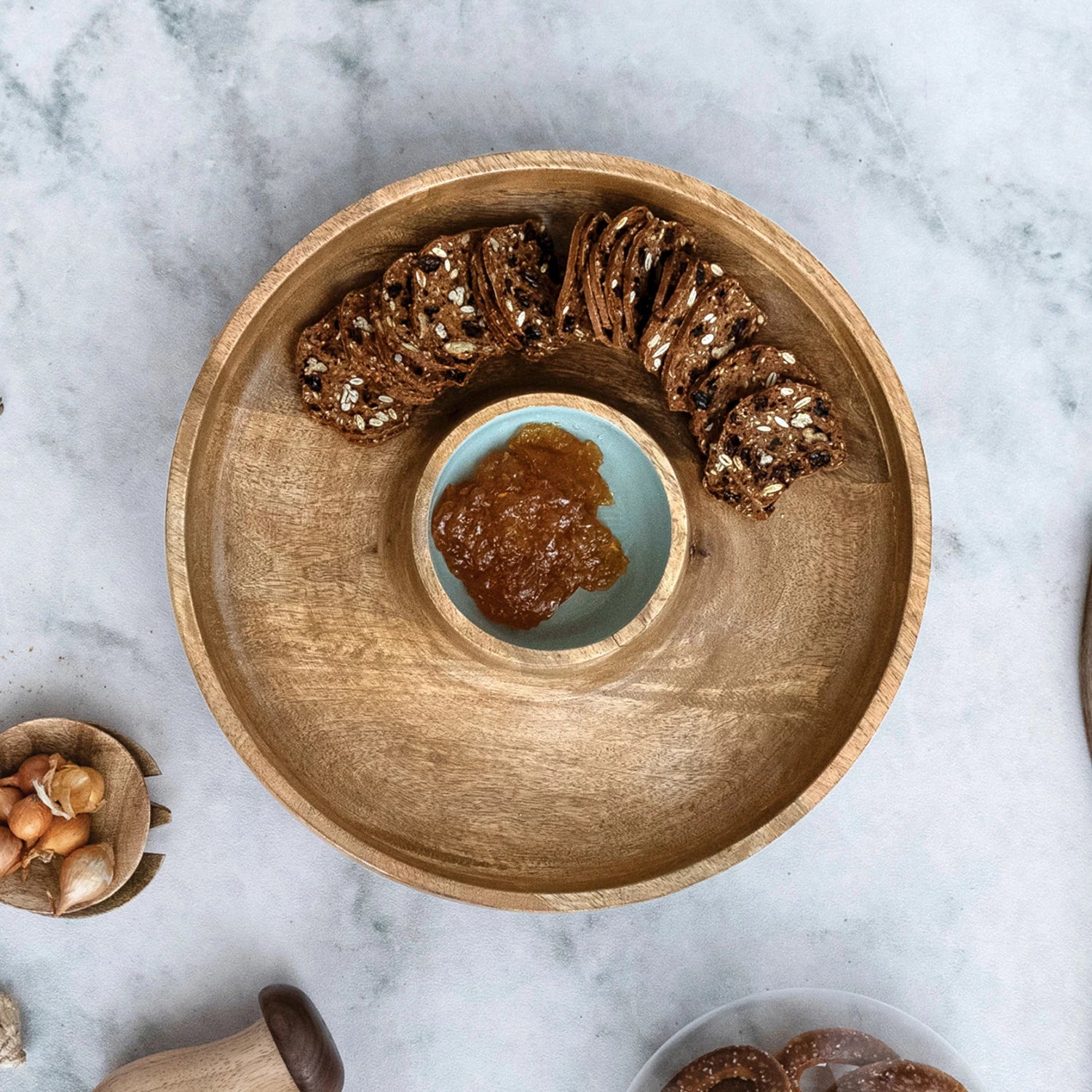 These collections of serving pieces are a must-have for every kitchen for those who love to cook and serve delicious food. They can find the ideal dishes for every table in classic white, vibrant colors, or modern patterns. The serving pieces come in various shapes, sizes, and materials, such as ceramic, stoneware, porcelain, or glass. They can create their unique style by mixing and matching them or choose a matching set for a coordinated look. These serve ware are not only picture-worthy, but also durable, microwave-safe, and dishwasher-safe. These collections of serving pieces will make every meal more fun and memorable, whether they are hosting a dinner party, a family gathering, or a casual brunch. This lazy Susan server, which is crafted from high-quality mango wood with a natural finish and a blue enameled center section, provides ample space and a striking contrast for serving dishes. The combination of natural mango wood and the bold blue enameled center makes this lazy Susan server a versatile piece that complements a range of home decor styles, including rustic, coastal, or eclectic. The lazy Susan design allows for easy rotation, providing convenient access to the two divided sections, ideal for serving a variety of appetizers, dips, condiments, or snacks. or for displaying colorful fruits, showcasing dessert. Made of mango wood and metal.