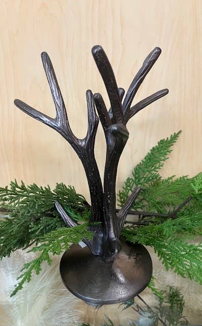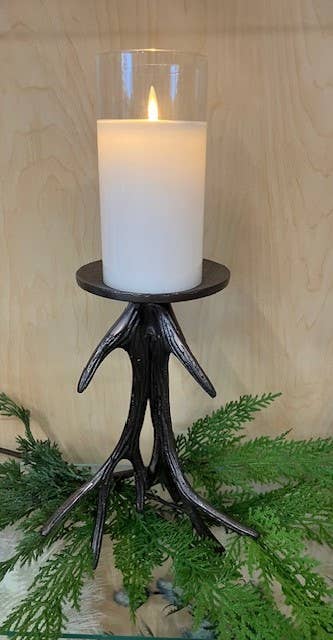 This candle holder is ideal for cabin, lodge and Christmas decor. It is made from metal with a bronzed finish. Set a candle on top or flip it over and use as table top decoration. Accessories shown are not included.