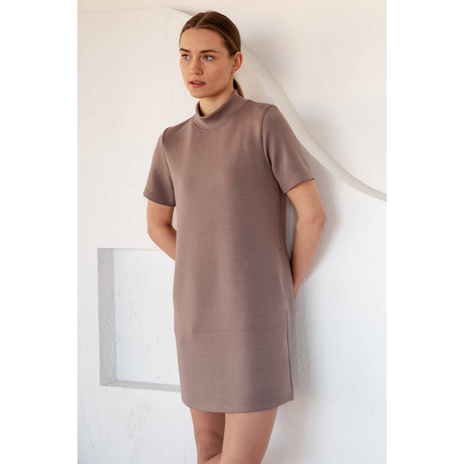 - Features: - Modal poly span scuba fabric - Silky smooth and lightweight - Standard fit - Mock neck - Mini dress - Short sleeve - Side pockets