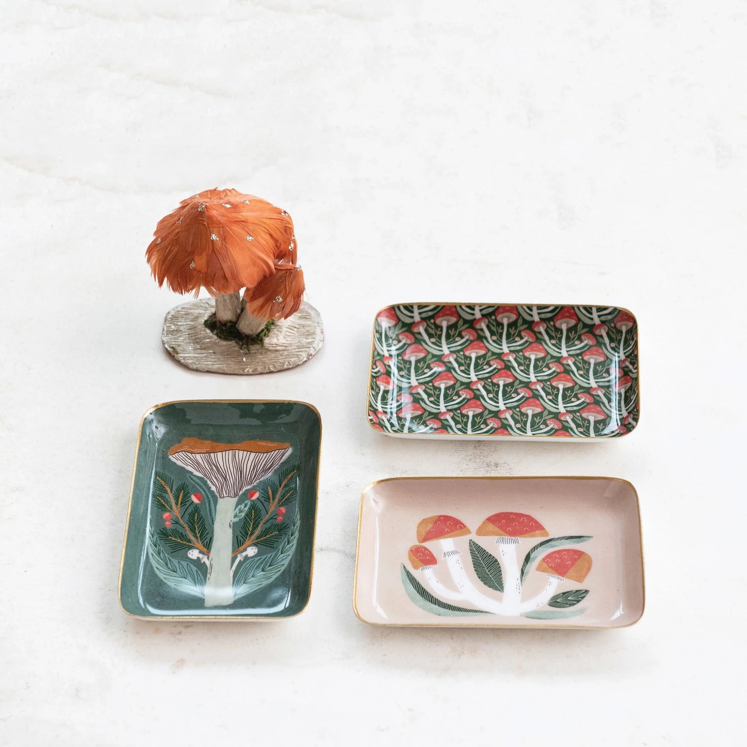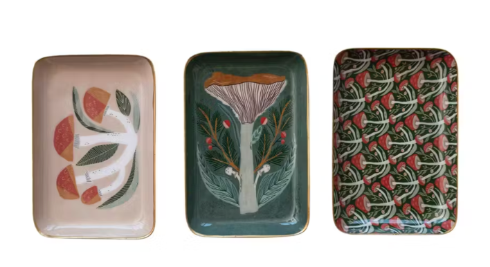 These pretty little trays add freshness to any setting with playful mushroom patterns that perfectly balance whimsy with elegance. These sturdy metal trays have curved edges with a smooth enameled finish.