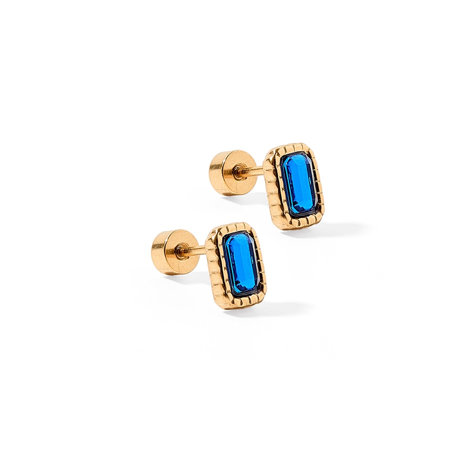 - Style Description: Rectangular stud with a sapphire stone in the center and detailed frame around the edge. 10mm in size.