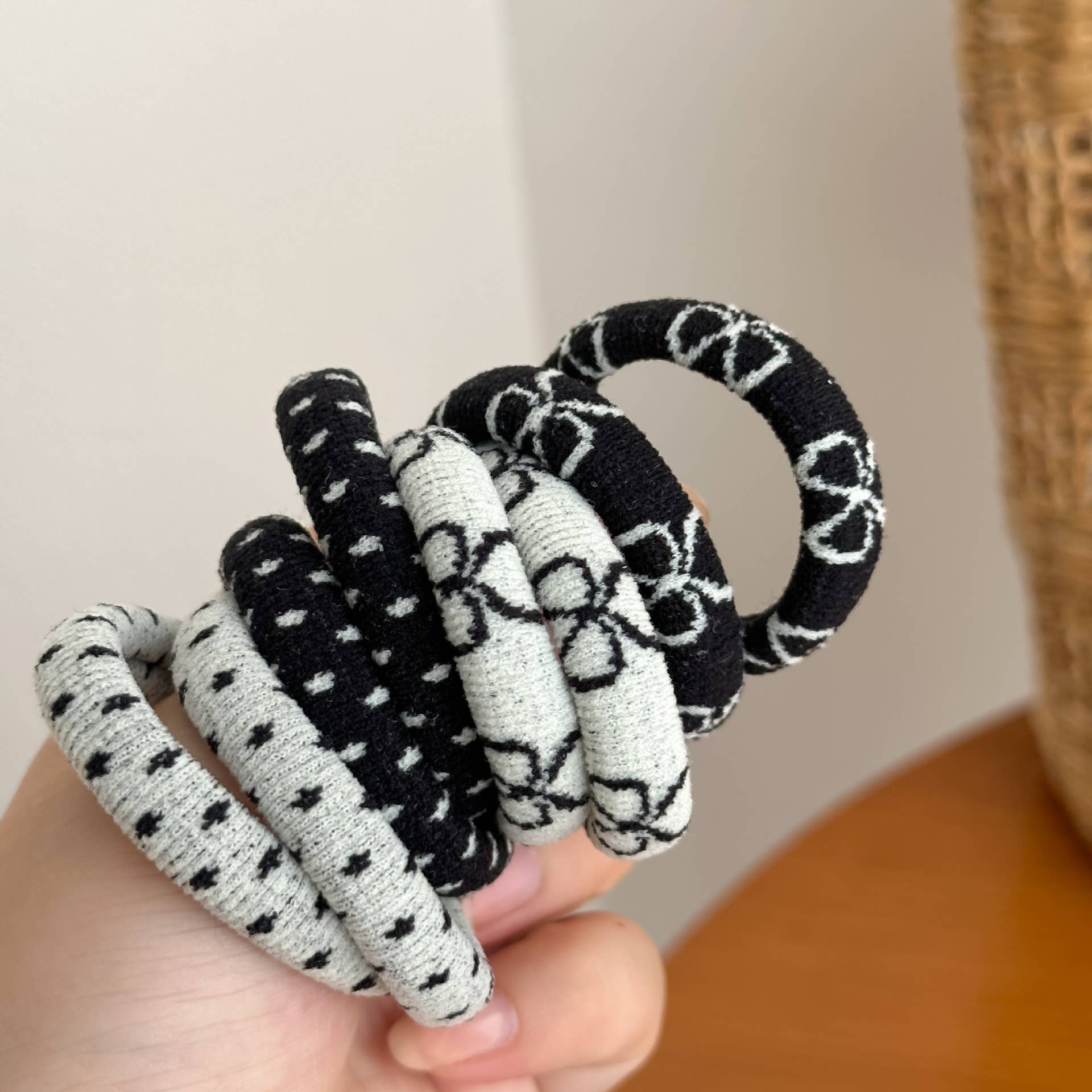 Seamless Bows & Dots Hair Tie (Set of 8) in grey and black The perfect hair tie bundle featuring bows and dots patterns in grey and black.