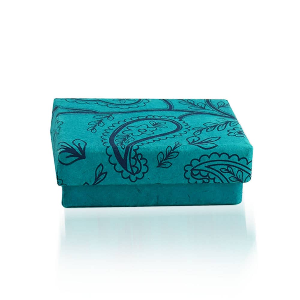 Give a handmade gift in a one-of-a-kind package! Scrap cotton and excess lokta paper is collected from local garment factories and paper makers in Nepal and turned into handmade paper, which is sun dried, hand dyed, and screen printed with traditional designs to create this truly unique handmade gift box. Great for earrings and other small gifts.