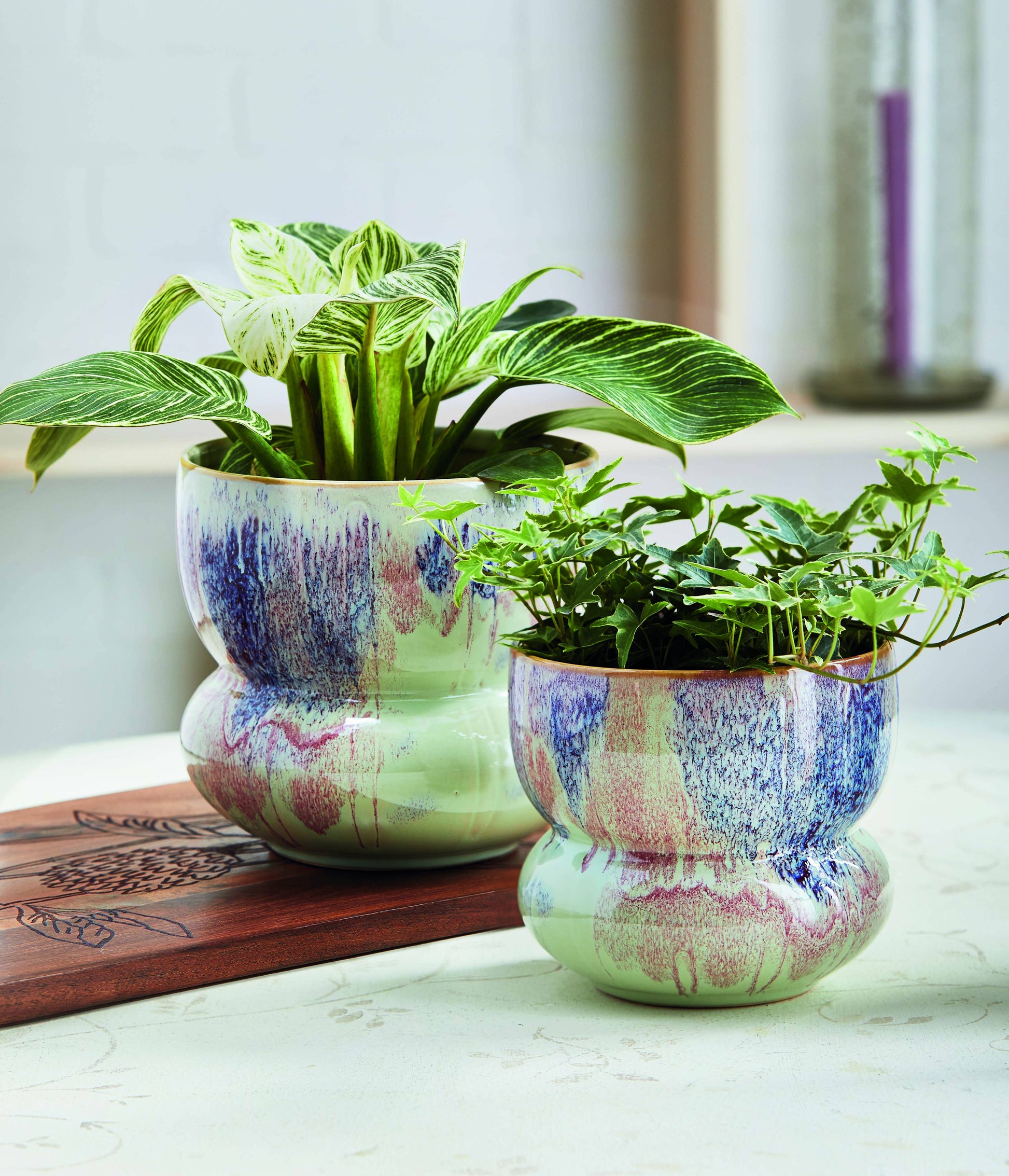 Made from purple stoneware, this planter features a reactive glaze for a unique look. A silicone plug is included for drainage control. This size is perfect for larger plants and holds up to a 6-inch drop-in pot.