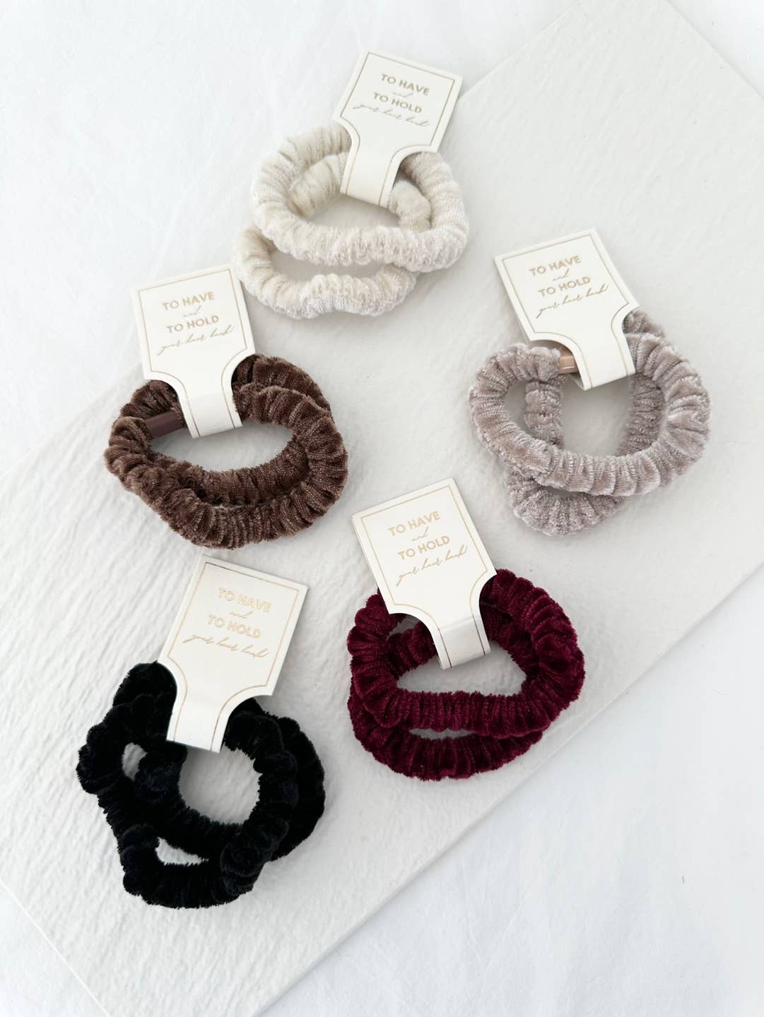 These luxurious velvet scrunchies come in a variety of chic, neutral tones, perfect for elevating any hairstyle. Soft, stretchy, and gentle on the hair, they provide a secure hold without causing breakage. Whether you're styling a casual ponytail or an elegant updo, these scrunchies add a sophisticated touch to your look.
