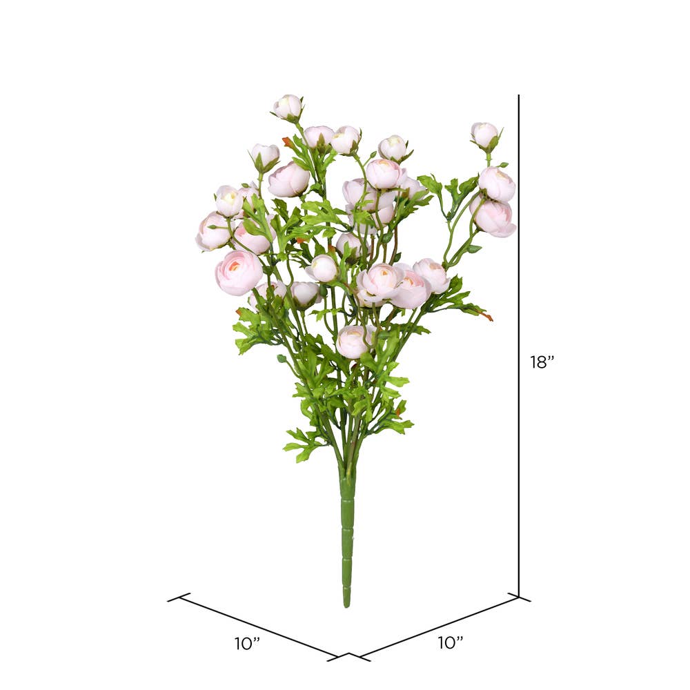 Vickerman 18" Artificial Pink/Yellow Ranunculus Bush. This bush is the perfect addition to any decorative container for a maintenance free arrangement. 80% POLYESTER, 10% PLASTIC, 10% IRON WIRE