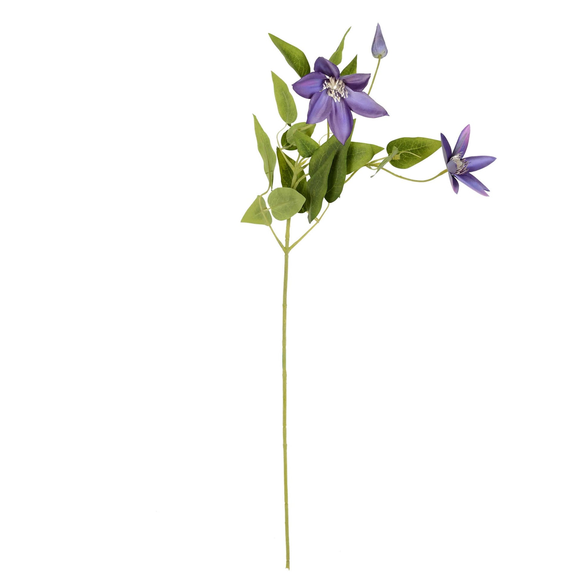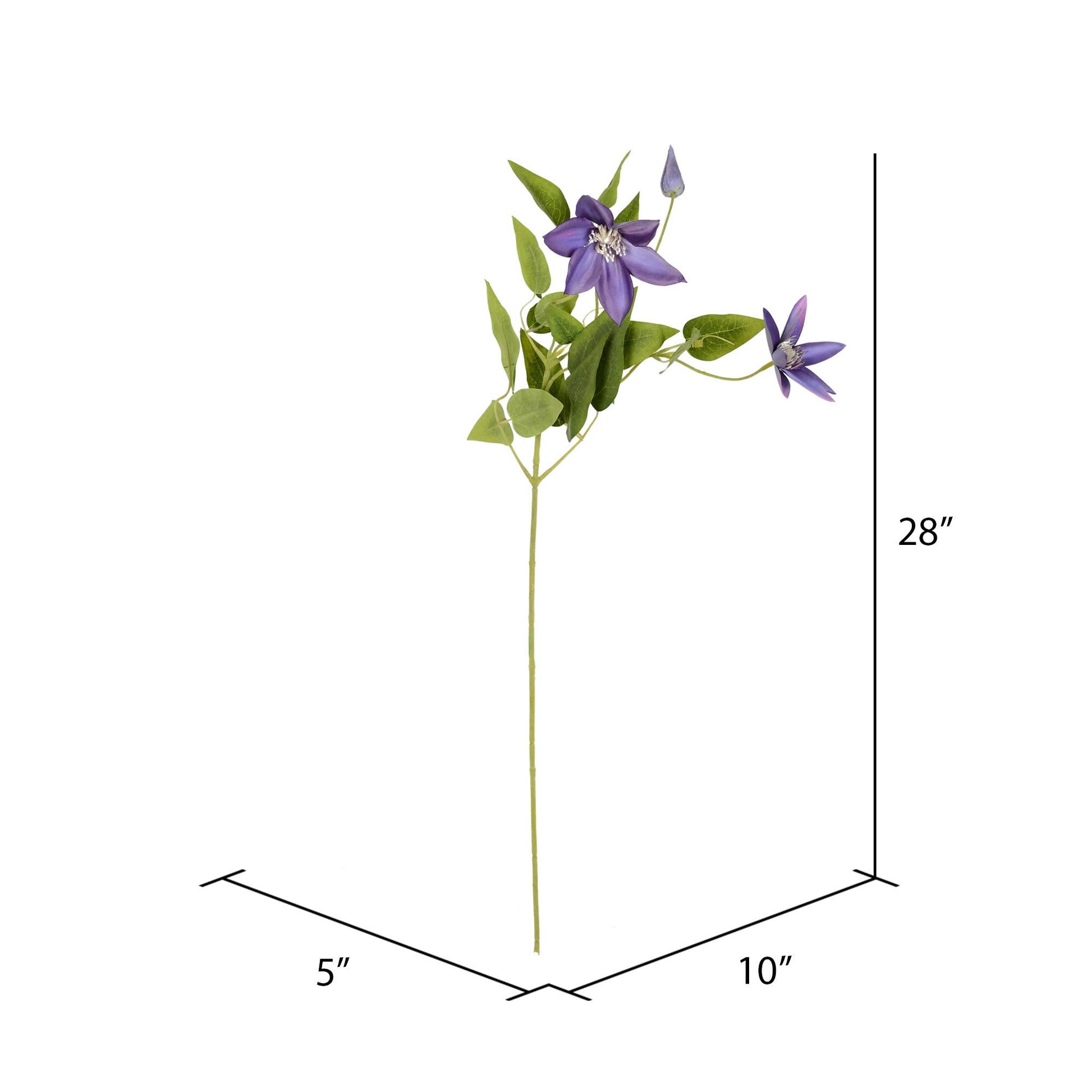 Vickerman 28" Artificial Light Purple Clematis Stem. Add A Pop Of Color And Elegance To Any décor with this Beautiful Clematis Stem, featuring 2 fully opened blooms, 1 new growth bud, and rich green foliage accents. It makes a wonderful addition to any arrangement, or Display this brilliant Clematis stem on its' own in your favorite decorative vase. This colorful stem will stay fresh season after season.