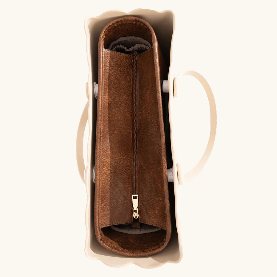 Our Contrast Liner offers both functionality and style. The vegan leather contrast accents elevate the appearance of your tote, adding an elegant touch to your ensemble. Inside, you'll find multiple pockets designed to accommodate all your essentials, keeping them organized and easily accessible. Crafted from durable neoprene material, this liner ensures longevity and is fully washable for easy maintenance.