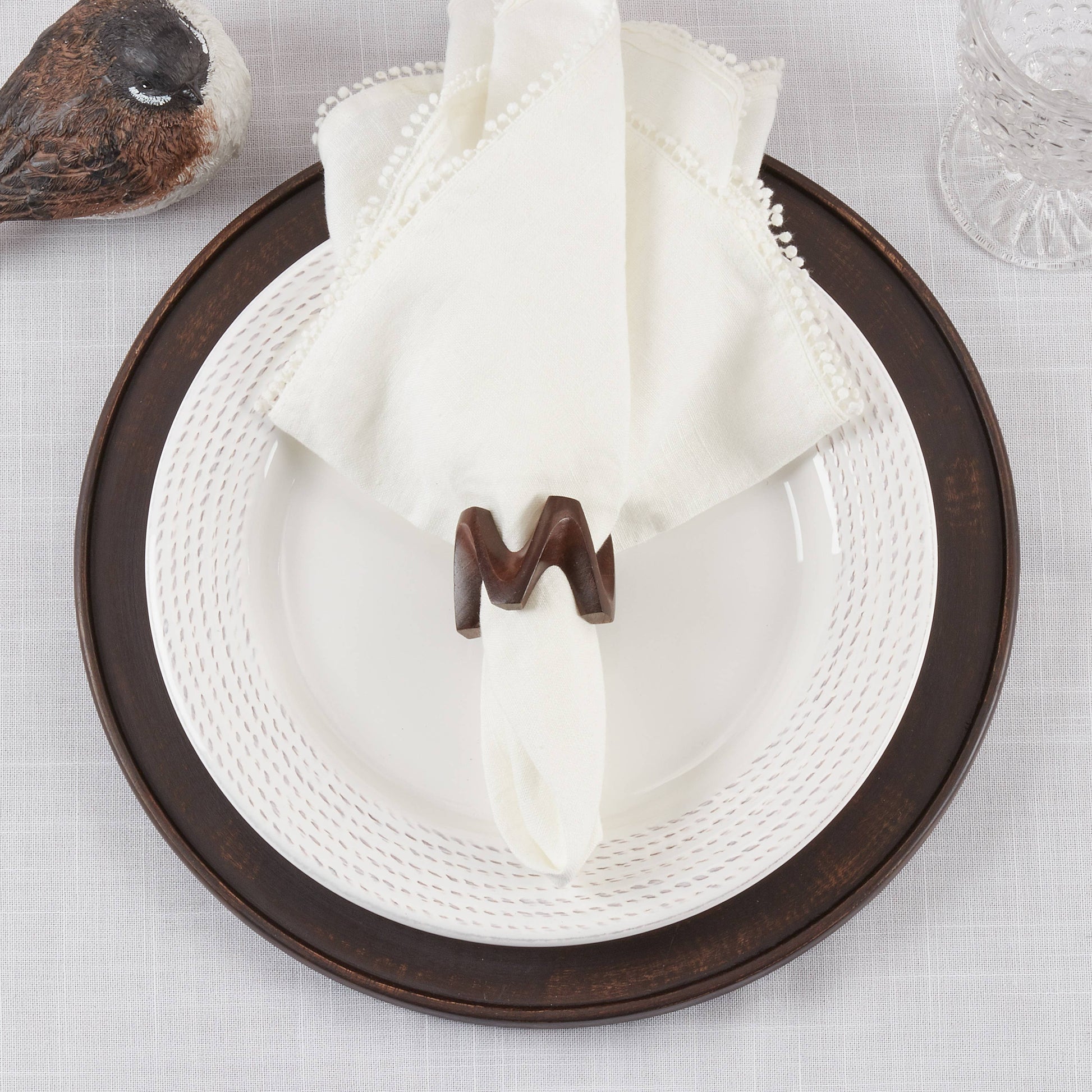 The W Design Wood Napkin Rings are a great way to add style and charm to a casual dining table. Their natural look and feel don't overwhelm or overshadow, yet their jazzy design elevates the tabletop décor. The set is easy to pair with a wide range of tableware, working well with dark color charger plates.