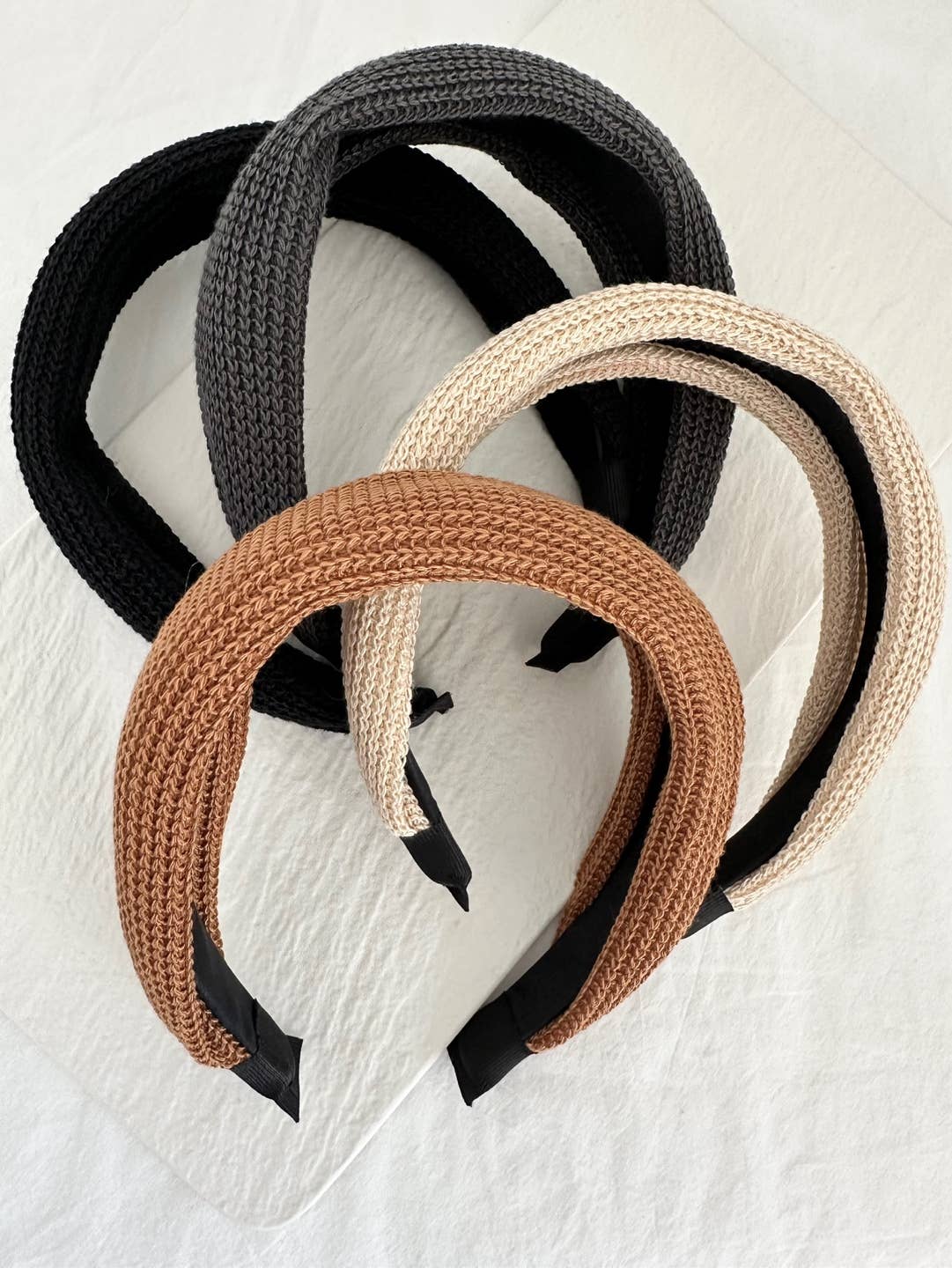 These thick, padded headbands are crafted from textured woven fabric in versatile neutral shades of black, dark gray, warm brown, and soft beige. The intricate knit design adds a cozy, stylish touch, making them perfect for any season. Designed for comfort and durability, these headbands provide a secure yet gentle fit, effortlessly elevating both casual and dressy looks.